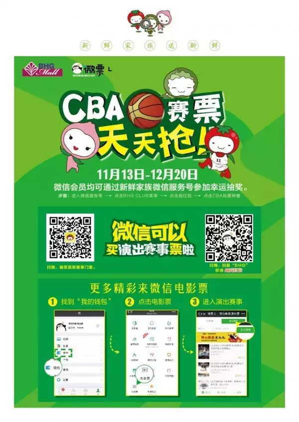 微信会员通过新鲜家族微信服务号(微信号:BHG_xxjz),参加幸运大转盘抽奖, 即可享受CBA赛票天天抢活动,抽中就有大奖。