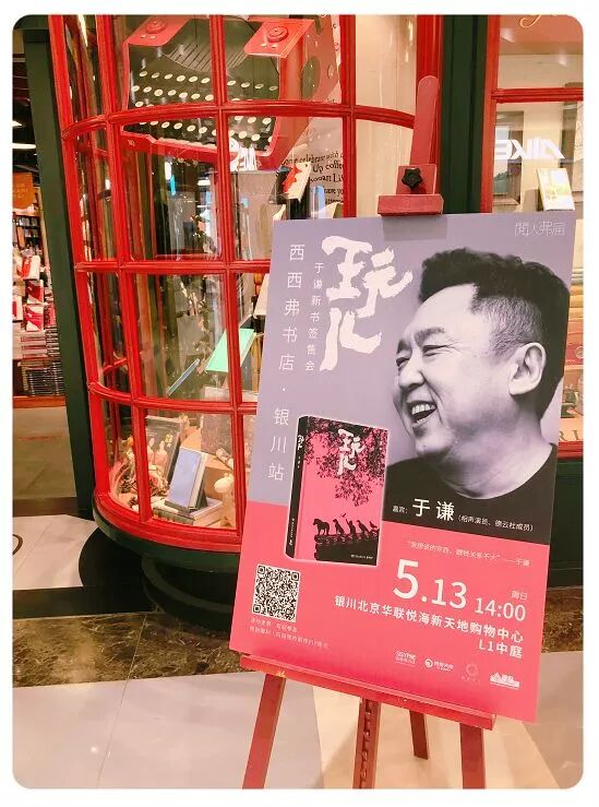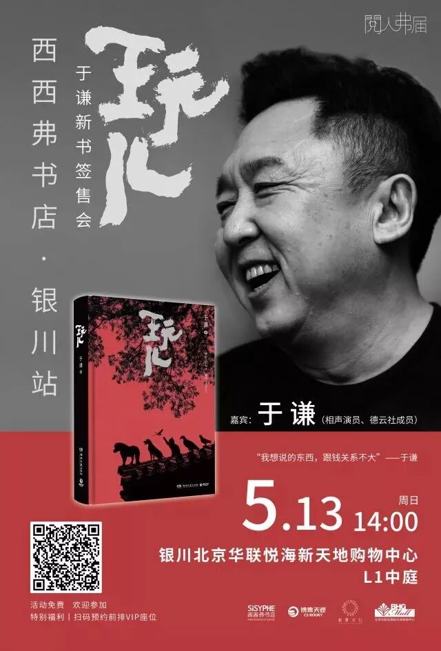 于谦《玩儿》 北京华联悦海新天地购物中心 西西弗书店新书签售会 于谦《玩儿》西西弗书店新书签售会 嘉宾 于谦 时间 5月13日(周日)14:00 地点 西西弗书店·银川悦海新天地店 (银川北京华联悦海新天地购物中心L1中庭) 亮点推荐 选择“玩儿”, 就是选择用自己喜欢的方式过一生。  谦儿哥带你玩儿出文化, 玩儿出水平, 玩儿出老北京style。 西西弗书店·银川北京华联悦海新天地店 于谦老师新书《玩儿》已面向全城火热开售 想要谦儿哥签名的小伙伴,记得提前去买书哦