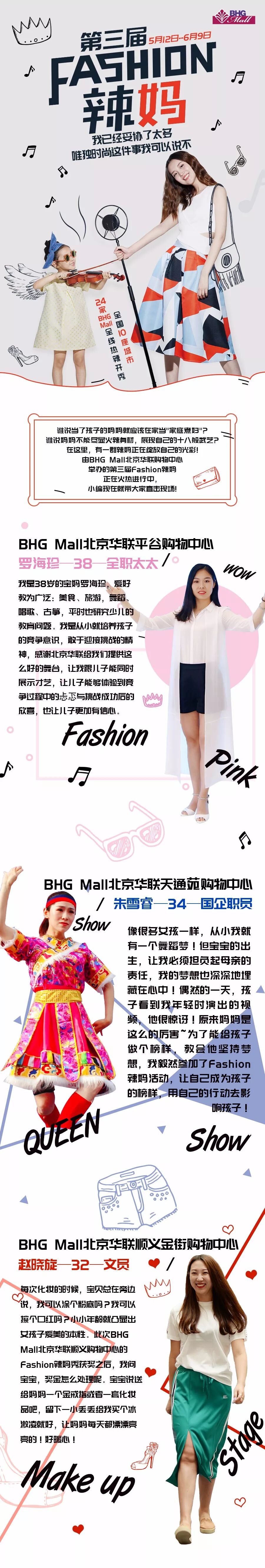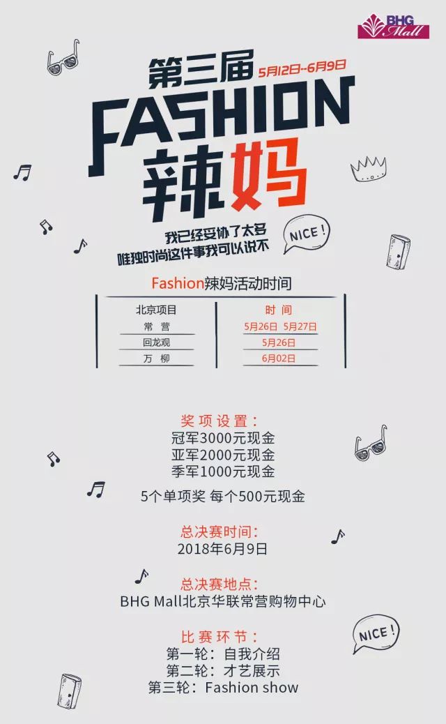 这里是各位辣妈们的主场, Fashion 辣妈们火力全开, 妈妈们原来也可以有“辣”的一面, BHG Mall北京华联购物中心  第三届 Fashion 辣妈比赛持续进行中, 小编会带大家 目睹更多冠军辣妈们的风采, 怎么样?有没有很期待?! 我们线下的比赛现场也很精彩哦!     各项目冠军来BHG Mall北京华联购物中心的总决赛投票由BHG 积分管家的部分投票+Yoka时尚网的部分投票+比赛现场当天的投票组成,线上部分的投票时间截止6月8日 24:00。   Yoka时尚网是全国前5大时尚类垂直媒体,官方微博有900万粉丝群体和百万明星内容入驻,是时尚类媒体微博第一大号,并且总冠军会在Yoka时尚网官方微博进行公布。