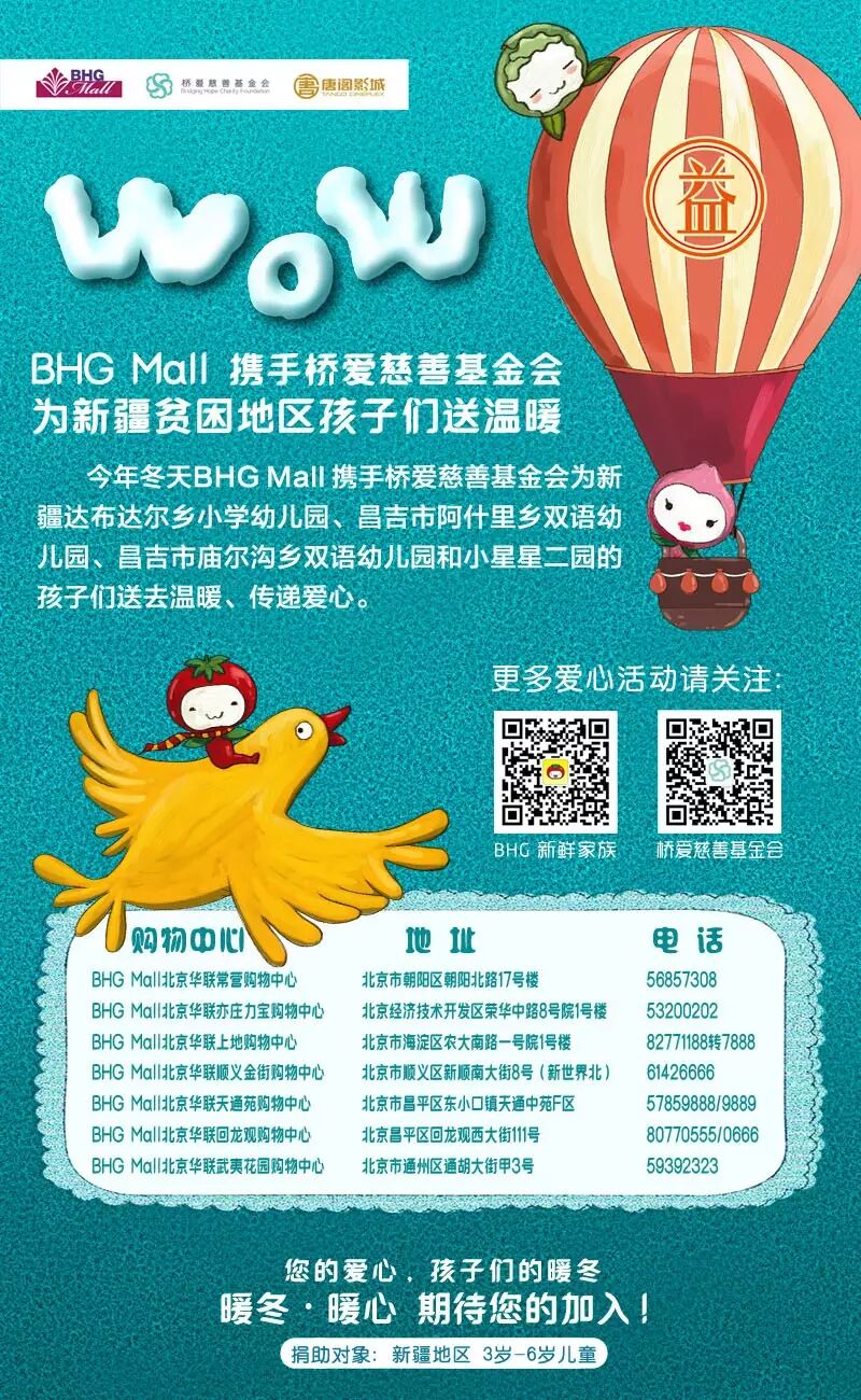 今年冬天,和我们一起来做公益,把您的旧衣服送到离您最近的BHG Mall服务台,我们帮您送到新疆贫困的孩子们,同时为鼓励您的爱心,BHG Mall还将送您贴心小礼物~