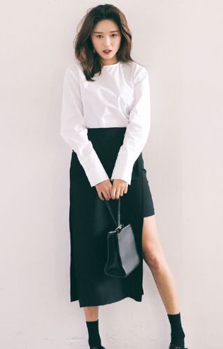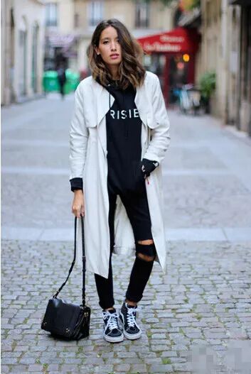 ▲白衬衫+开叉小黑裙 ▼风衣+破洞裤