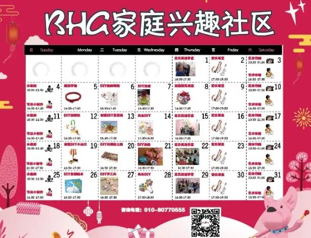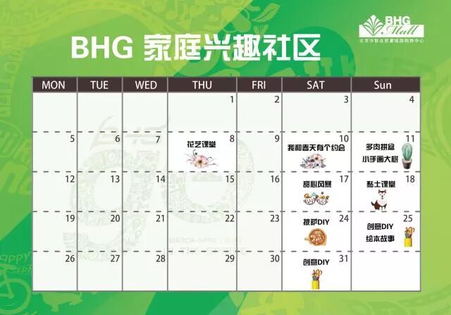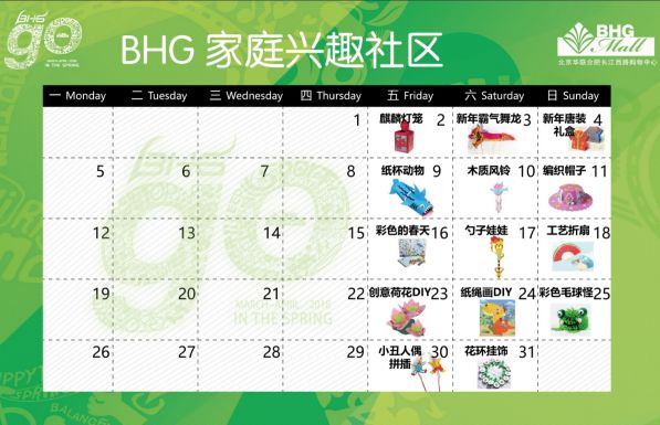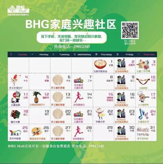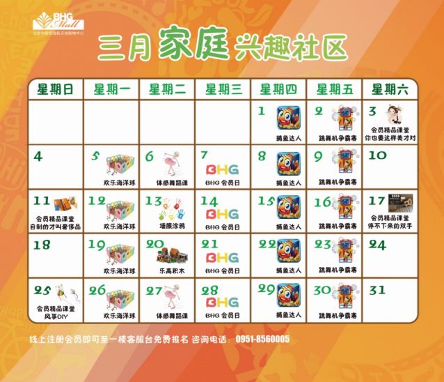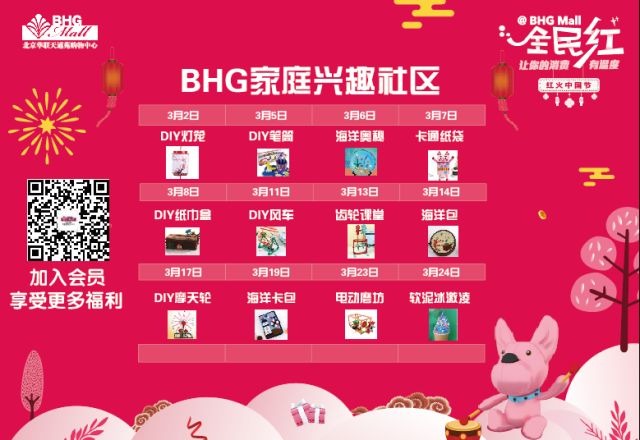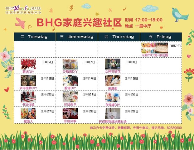 控制情绪 熊孩子的最大问题可能就是情绪问题,因此学会情绪控制尤为重要。 这里需要父母去做引导:可以有负面情绪,但不能一直陷入进去。当然情绪控制是一辈子的事情,不仅孩子们,大人也需要做好控制。如果你总随意发火打骂,又怎么能引导孩子学会克制呢? 参与家务 偶尔让孩子“主持”你的钱包,逛超市学做饭。 让孩子做简单的力所能及的家务,其实亦是在培养ta的家庭责任感,作为家庭一份子,有义务一起承担家庭责任。 培养兴趣爱好 你对孩子而言最重要的意义是陪伴,那在新的学期里不妨与孩子一起挖掘共同的兴趣爱好?可以是棋类、唱歌、手工,又或是一起看电影、看同一本书等。 新学期,带上你家宝贝, 一起加入BHG家庭兴趣社区, 这里不仅有手工、画画、创意DIY等课程, 还有舞蹈、瑜伽、武术等适合大人的课程。 一起培养爱好的同时, 也是你与孩子独处的时间~ 用简单的方式为他发现更广阔的世界, 也拉近彼此的距离。 BHG Mall 北京华联龙背村 购物中心 BHG Mall 北京华联万柳 购物中心 BHG Mall 北京华联天通苑 购物中心 BHG Mall 北京华联回龙观 购物中心 BHG Mall 北京华联合肥长江西路 购物中心 BHG Mall 北京华联合肥蒙城路 购物中心 BHG Mall 北京华联悦海新天地 购物中心 BHG Mall 北京华联包头 购物中心 2018年度潮童大赛 活动时间:3月7日 活动地点:一层中厅 活动内容:携小白鸽艺术团,开年首秀儿童潮装,激发家长、孩子的时尚视感。 小小厨师 活动时间:3月13日 活动地点:1层必胜客走廊 活动内容:携金宝贝、必胜客邀约会员家长、孩子一同现场制作美味披萨,开发孩子的动手动脑能力。 成长日历DIY 活动时间:3月22日 活动地点:三层中厅 活动内容:携手金宝贝,邀约会员顾客及孩子,携带孩子家庭的成长照片,现场发放工具,由老师引导创作属于自家温馨日历。 会员生日会 活动时间:3月28日 活动地点:1层中厅 活动内容:邀请500积分以上的会员前来参加,现场发放神秘信封,各自填写新年祝福,现场互动抽取,更有精美礼品拿。 具体活动以店内明示,详询服务台