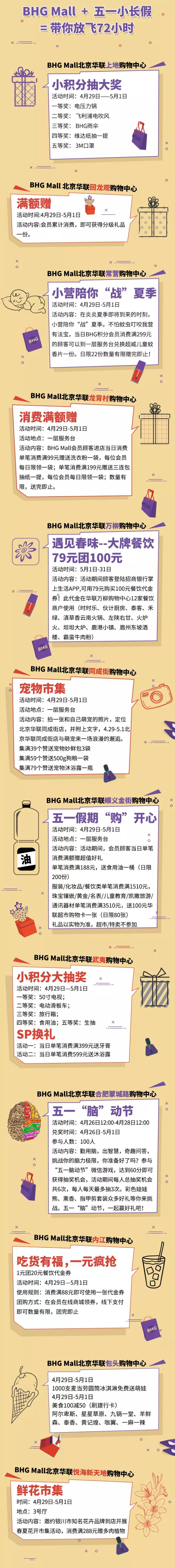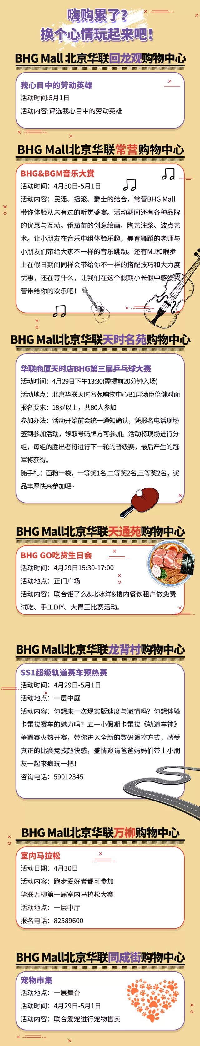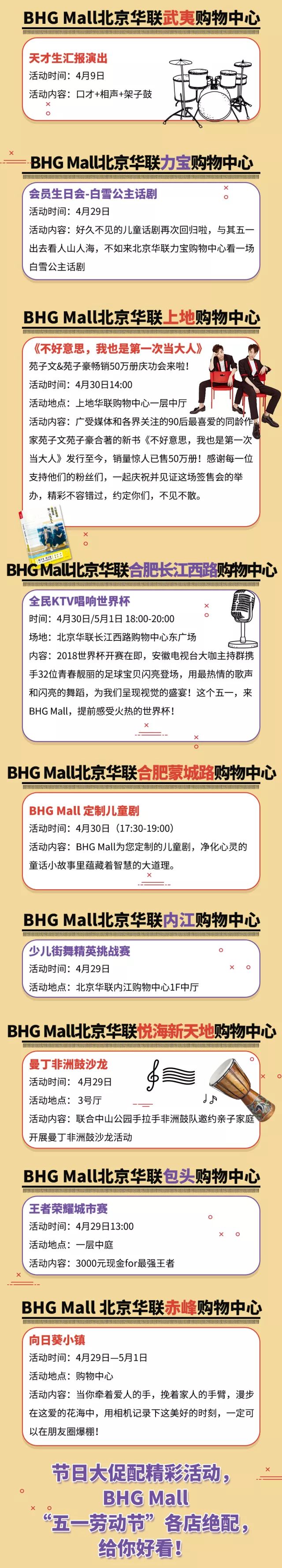 BHG Mall五一假期停不了! 美食百道吃不停~ 畅玩活动乐不停~ 节日大促购不停! 具体活动以店内明示,详询服务台